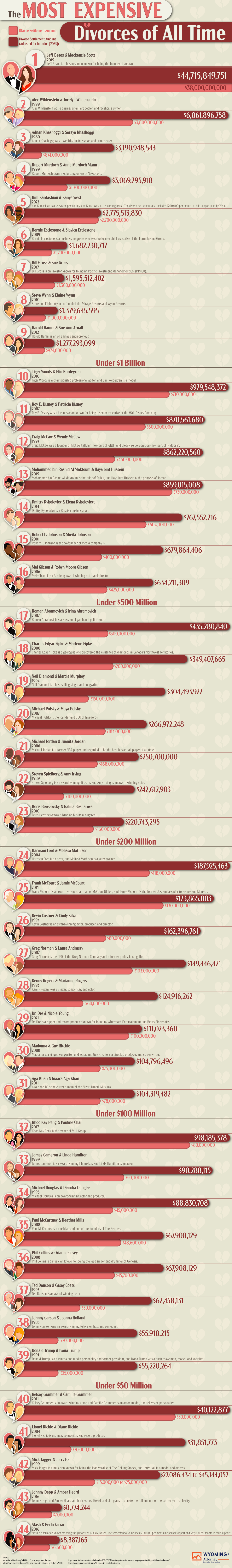 Researchers at WyomingLLCAttorney.com looked at available data on divorces to determine which divorces throughout history had the largest costs. The numbers are adjusted for inflation. Keep reading to see which divorces came out on top!